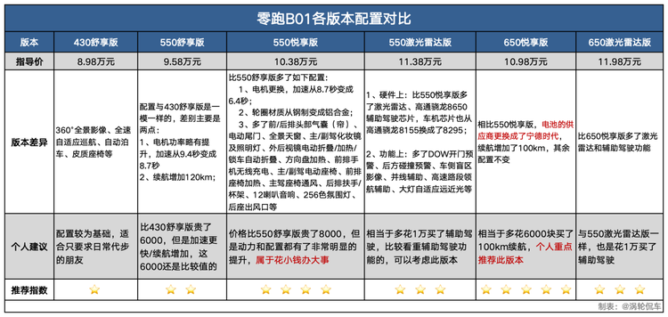 其实从产品力来看,零跑B01无论是外观/内饰的设计,还是三电系统,整体的表现都算是比较均衡的,找不出明显的短板,目前它提供了6个不同的版型,我们来聊聊哪个版本更值得推荐。