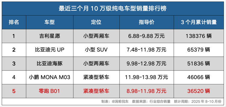 先看销量,零跑B01是2025年7月底上市的,8、9、10三个月的累计销量是36520台,对一台刚上市的车型而言,月均销量超过1万台已经算得上优秀了,这样算下来平均每天能卖掉406台,每小时卖掉16-17台,相当于每三四分钟就能卖出去一台,不夸张地讲:可能等你看完本篇文章,人家又卖掉了一台车。