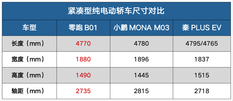 在车身尺寸方面,零跑B01轴距2735mm,车长4770mm,车宽1880mm,车高1490mm,与同级别的小鹏MONA M03、比亚迪秦PLUS EV相比,零跑B01与前两者的个头儿相差不大,都是比较标准的紧凑型三厢轿车的身材。