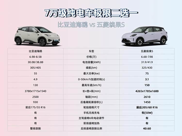 随着生活条件越来越好,更多家庭开始购入第二台车。女主人接送孩子或老人,有这么一台代步车不用担心刮风下雨或者寒冷天气,不过多数消费者在考虑这个级别定位的车型时会更注重性价比,大家都想要以更低预算买到更高品质,所以今天我们就来聊聊五菱银标旗下 缤果S(参数|询价)和比亚迪的海鸥,这两款预算七八万就能将高配车型开回家的纯电动代步车,究竟怎么选会更合适一些呢?