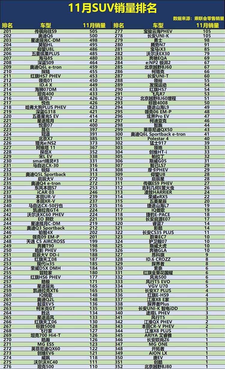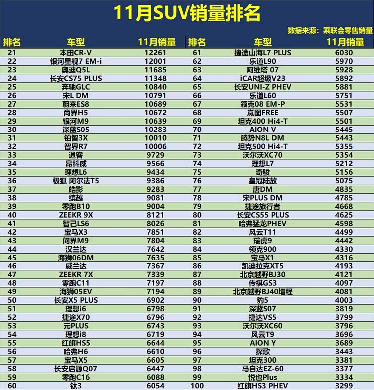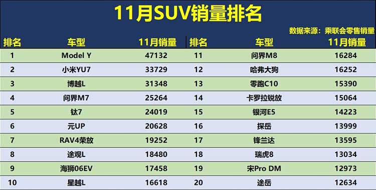 进入年底冲刺的11月,SUV市场的竞争热度丝毫未减。特斯拉Model Y以超过4.7万辆的销量稳居榜首,持续展现其头部地位。最大的惊喜来自 小米YU7(参数|询价),作为上市不久的新车,凭借超过3.3万辆的成绩空降亚军,势头异常迅猛。传统劲旅如博越L、问界M7紧随其后,月销均突破2.5万辆,构成了第一集团。在中段,本田CR-V、奥迪Q5L等经典车型守住了月销过万的基本盘,但排名已滑落至20名开外。整体来看,新能源车型的排名普遍前移,智能化新玩家表现抢眼,市场格局正处于快速重塑的过程中。新面孔搅局!11月SUV销量战报:钛7第5,CR-V、CS75 PLUS未进前20!