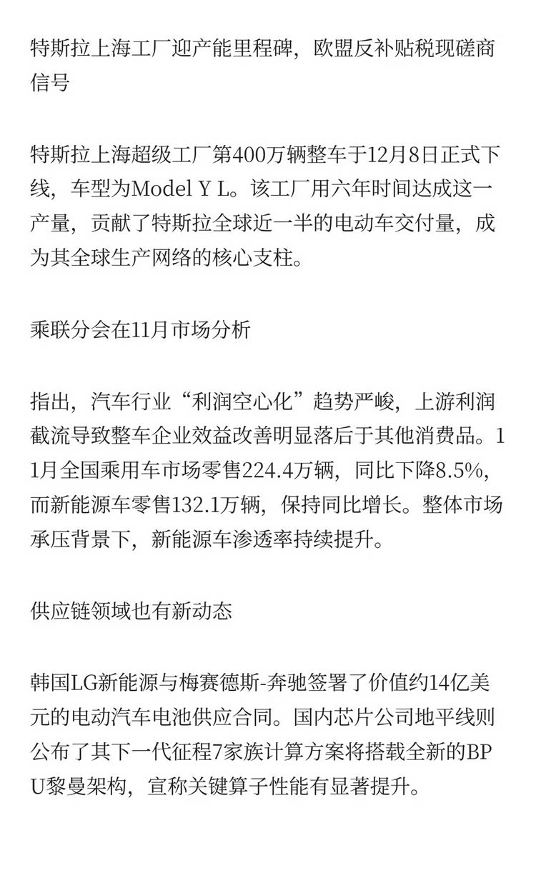 车家号·0浏览·2025-12-09 19:53 · 四川特斯拉上海工厂达成400万辆里程碑,供应链合作与新能源安全标准受关注。