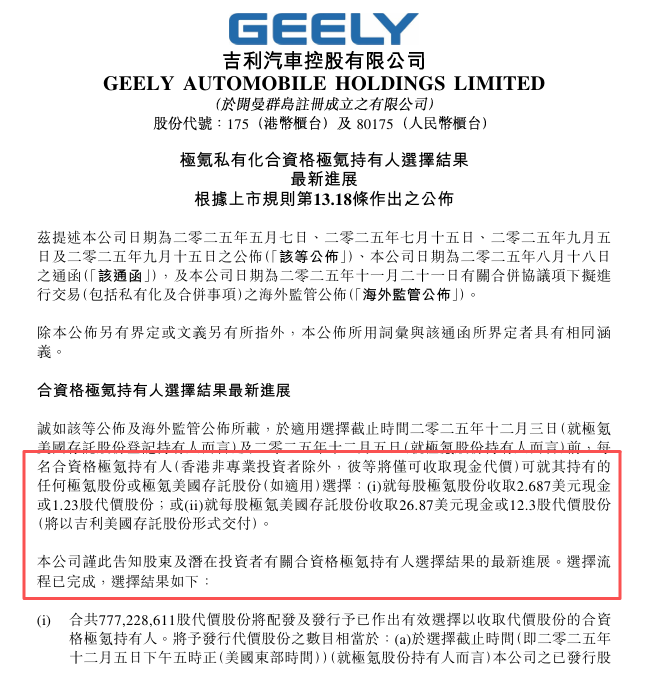 12月9日,吉利汽车集团发布公告,正式公布了极氪私有化交易中持有人对价选择的最终结果。近七成股东选择接受吉利股票,成为这场交易中最值得玩味的细节。