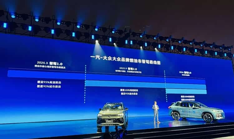 于是,从今年年初开始,一汽-大众便对外公布了行业首个「燃油车三步走」的智驾路线图,宣布一汽-大众将全面开启智能化时代。其中,1.0普及燃油车核心高阶智驾功能,覆盖全国95%高速路段和90%城市路段;2.0实现端到端大模型上车,覆盖全国100%高速路段和95%城市路段,实现燃油车智驾平权;3.0则是到2026年实现100%的高速和城市路段覆盖。