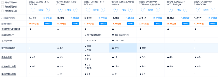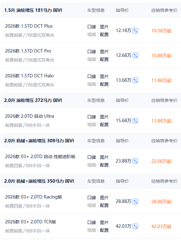 作为第三代车型的中期改款版本,2026款 领克 03(参数|询价)官方指导价区间为12.18万到42.03万元,入门版本能满足日常通勤,顶配的03+ TCR 版则跻身高性能车行列。这样的大范围的价格跨度,能够覆盖不同需求客群,既能适配普通家庭的出行需求,又能满足性能驾驶爱好者的核心诉求。