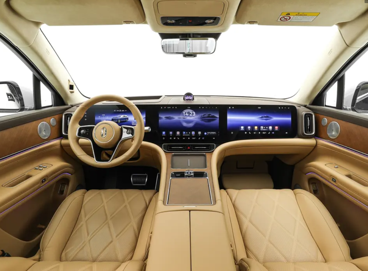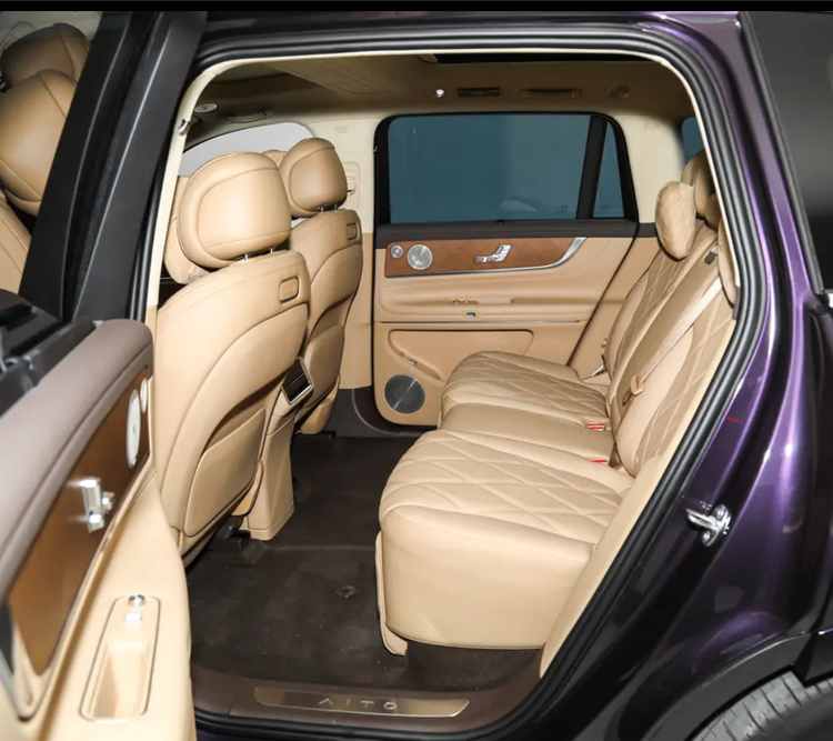 来到内饰,老板更在乎身体健康,所以华为问界M9的卖点就是采用了抑菌率≥99%的Nappa真皮材质,而且覆盖面积高达百分89以上,从而营造出更高级触感,在缝线工艺上也采用菱形格设计,在颜色选配上采用棕色,配合棕色木纹饰板后,车内带来更温馨更高级的质感。而且它的座椅采用航空头等舱的布局,内置25个扬声器,高低音都有,音响品牌来自华为SOUND,4D立体音效拉满。但我觉得它缺少创新和创意,毕竟整个布局和问界M8一样,并没有让人眼前一亮的效果。但它的科技感的打造还不错,12.3英寸+15.6英寸+16英寸组合的三大屏支持互联,手指滑动互联,车机升级为HarmonyOS 4,智能化更高,智驾系统更有保障。比如它语音唤醒仅在3秒内就实现并同步执行,在预算和算力上都得到提升。