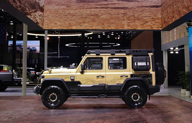 这种“全副武装”体现在外观以及性能的双重维度,新车采用了专门的“晨曦金”色彩搭配,设计的灵感源自地理概念范畴内的“等高线”,延伸出别具一格的“高地纹”门饰板与车身贴,更惹人注目的是它极具军事战术风格的各类组件,包含着防滑抗撞的侧踏板、瞄准镜模样打造的门把手、迫击炮造型的涉水喉、武装带安全扣造型的前保以及防爆网式的灯罩。这些设计并非只是样子好看罢了,而是兼顾了功能的实现与视觉的张力呈现,精准对应了越野爱好者、战术爱好者以及“颜值控”群体的审美渴望。