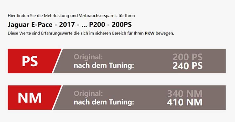 在动力系统上,捷豹E-PACE采用Ingenium 2.0升四缸涡轮增压发动机,为200Ps、250Ps和300Ps低、中、高三种功率,全铝合金结构、连续可变气门升程 (CVVL) 技术、双涡管单涡轮、燃油直喷:200bar电磁直喷,中置喷嘴等先进技术于一身,此台车属于低功率的P200,发动机最大功率147kW(200Ps)/5500rpm,峰值扭矩320N·m/1200-4500rpm;与发动机相匹配的均是ZF的9AT变速箱。在实际驾驶中低功率版本的动力迟滞与低档位换挡衔接不顺的问题很显著,影响了驾驶的乐趣,为了能在安全范围内拓展出这款车在国内最佳的动力与操控,一对一定制的刷ecu是个不错的选项。