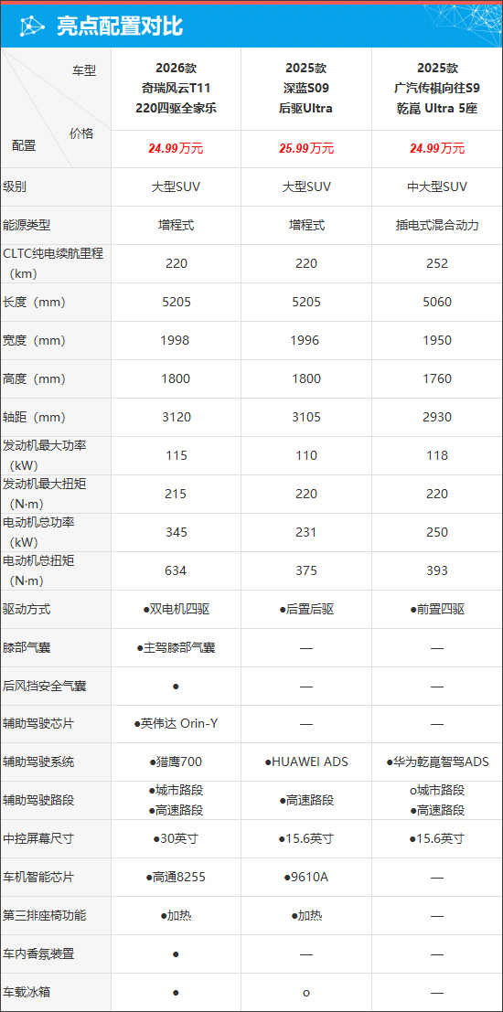根据售价区间来看,2026款奇瑞风云T11的入门车型价格最低,2025款深蓝S09不仅入手门槛最高,而且顶配版车型的价格也最贵。相比之下,定位更低的2025款传祺向往S9则介于两者之间。车型数量方面,2026款奇瑞风云T11和2025款传祺向往S9均有4款,2025款深蓝S09共有6款。