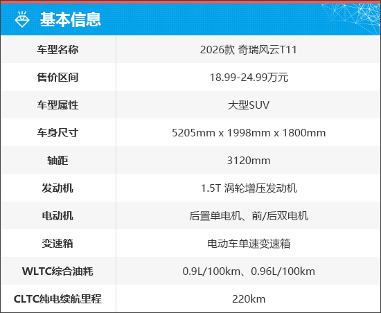 2026款奇瑞风云T11共推出4款配置,售价区间为18.99-24.99万元,超级增换购限时抢鲜价17.99-23.99万元。新车搭载增程式动力系统,根据配置不同,配备猎鹰500和猎鹰700辅助驾驶系统,覆盖高速、城市以及泊车场景,高速NOA支持上下匝道以及超车变道。