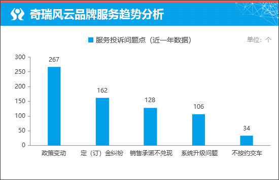 从服务投诉问题点来看,“政策变动”成为车主投诉相对较多的服务问题。通过进一步分析可知,该问题主要来自奇瑞风云A9L车型。