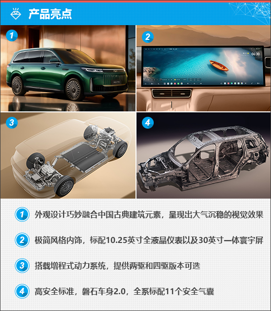 新车全系均搭载增程式动力系统,提供两驱和四驱版本可选。其中,1.5TGDI高效能增程专用发动机最大功率115kW,最大扭矩215N·m。两驱版车型搭载后置单电机,电动机总功率195kW,总扭矩324N·m,电池能量为33.68kWh;四驱版车型搭载前/后双电机,电动机总功率345kW,总扭矩634N·m,电池能量提升至39.92kWh。虽然配置不同,但是官方公布的CLTC纯电续航里程均为220km。