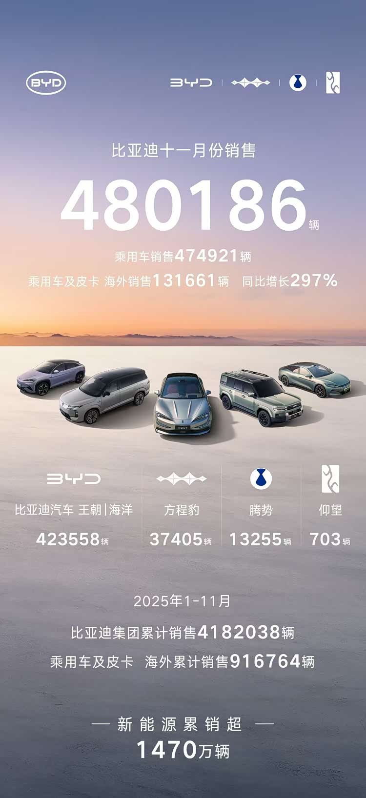 事实上,欧洲销量再创新高的背后,是比亚迪整个海外市场成绩的缩影。2025年1-11月,比亚迪乘用车及皮卡海外累计销量已突破91万辆;仅11月单月海外销售即达131,661辆,同比增长297%。比亚迪全球新能源汽车累计销量已超过1470万辆。