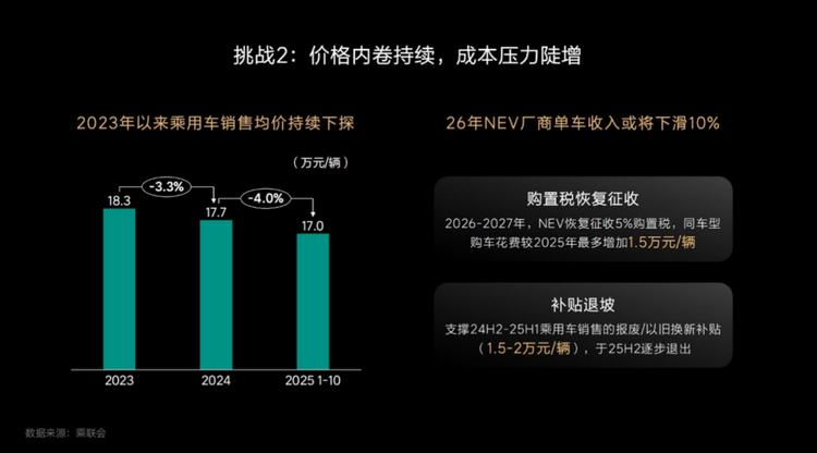挑战二,面临价格的内卷。新能源车的成交价每年还在持续下降,到今年和去年比又下降4个点,中国平均成交价新能源车17万元,到明年的话购置税会退坡一半,然后地方补贴陆续都会退坡。