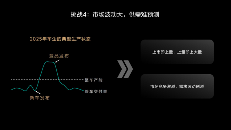挑战四,市场波动大,供需难预测。一个新车发布,尤其是一款产品力比较好的车出来以后,上市即上量,上市到巅峰,SOP+3或者+6里需求是最旺盛的,伴随着竞品的涌入他的需求又会迅速回落。这对供应来说挑战很大,到底合作伙伴的产能应该怎么准备才能应对这个?