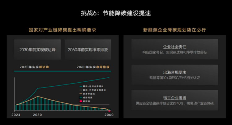 挑战六,节能降碳,这不多说了,我们确实做得晚了一些。在原本我的意识当中,我们做的节能减碳只是节流,真正开源还是需要靠国家的能源结构。