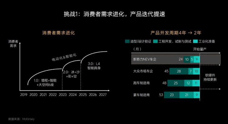 首先是挑战一,消费者的需求在急剧变化和提升,产品迭代提速。过往从电动化到智能化,到接下来还有更大的需求,理想汽车也在实践怎么围绕车,把它打造成智能具身。