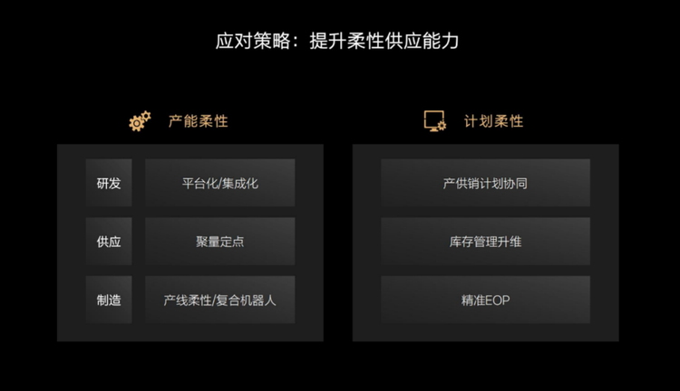 我们朝两个方向,一个是产能柔性,一个是计划柔性来解决问题。产能柔性,需要端到端构建通用化的能力,第一个是研发,研发还是要坚持做平台化和集团化,理想汽车这些年平台化能力做的还是不错的,但还是有很多空间。