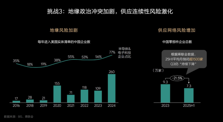 挑战三,地缘政治和供应连续性风险还在持续加剧。这是2024年的数据,进入美国实体清单有260家,趋势还在加剧。右边看整个供应网络,我们今年H1平均每个月倒闭的企业大大小小有1500家。