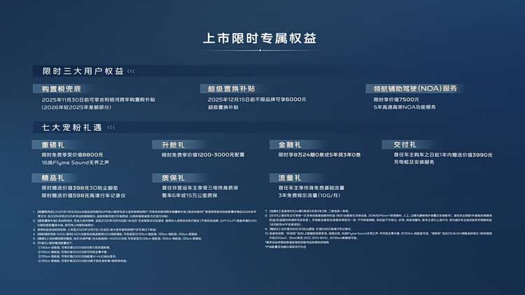 即日起下定,用户可享价值6000元的超级置换补贴、7500元的领航辅助驾驶NOA服务,以及购置税兜底政策三大核心权益;12月31日前下定,还能额外获得价值1200-3000元的舒享配置全系免费升级、8万24期0息等限时宠粉七重礼遇,综合优惠力度超1.3万元,入手门槛进一步降低。