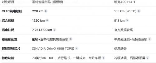坦克400 Hi4-T是为硬核越野而优化的工具。而福特智趣烈马更像一个面面俱到的“生活家”,它以显著更优的续航、油耗和跨代智能体验,为绝大多数用户提供了更均衡、更省心、也更有趣的出行解决方案。