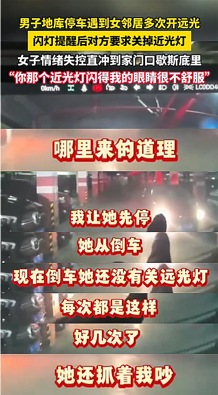 12月8日,在黑龙江一小区的地库里发生一起因错误使用汽车灯光导致的冲突事件。当日,一名男子驾驶汽车进入地库发现前方一辆车开着远光灯,刺眼的灯光影响其驾驶视线;随后其通过闪灯的方式提醒对方车辆司机关闭远光灯,但是对向车辆的女司机不仅没有切换灯光,还示意该男子关闭近光灯。