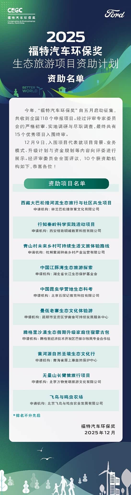 据不完全统计,截至目前,2025年“福特汽车环保奖”获资助项目历年来已为所在地社区带来超过360万元直接或间接收入,创造超220个就业机会。该10个项目的升级计划将于2026年起陆续实施,“福特汽车环保奖”将继续通过“资金支持、能力建设、资源链接、传播赋能”等多维支持,推动生态旅游成为乡村振兴与生态文明建设的重要力量。