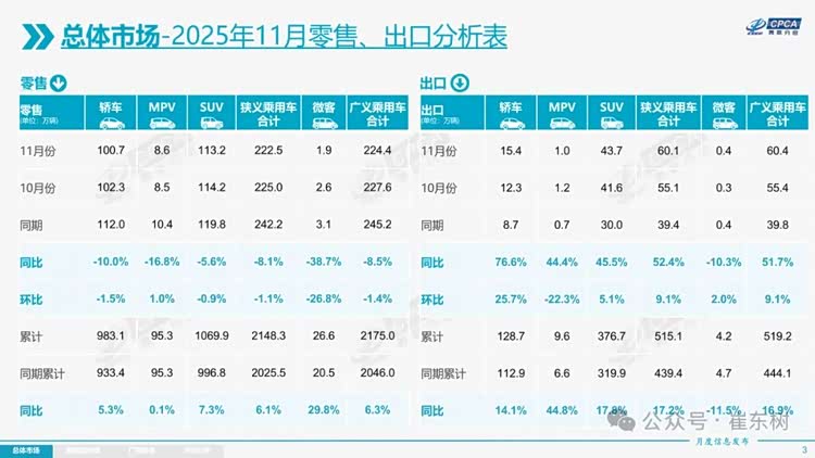 11月销量陆续公布,全国乘用车市场零售222.5万辆,同比下降8.1%,环比下降1.1%。细看一些企业的销量数据,其中包含海外市场销量,而国内市场整体表现不及预期。随着多地以旧换新和报废更新补贴政策收紧,车市消费出现观望心态,年底翘尾效应减弱。