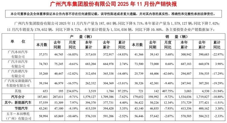 根据广汽集团公开的销售数据显示,该集团11月销量179652台,同比下滑9.72%,今年1-11月累计销量1534036台,同比下滑10.8%。无论是单月销量还是累计销量,广汽集团都是处于同比下滑中。