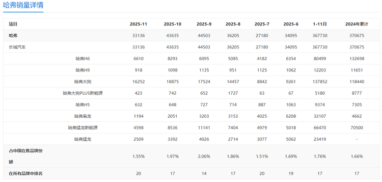 2025年11月的哈弗品牌有些波动,其本土市场零售销量为33136辆,出现了24.06%的环比下滑。出口方面倒是表现抢眼,只是保证本土市场的销量增势同样重要。于是有读者问为何哈弗品牌的销量会下滑,那就不妨先来看一看零售销量的详细数据。