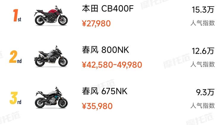 此类车型中排名前10的车型分别是:本田CB400F、春风800NK、春风675NK、春风450NK、KTM 790 Duke、川崎Z900、KTM390 Duke、雅马哈MT-03、升仕703R、春风250NK。