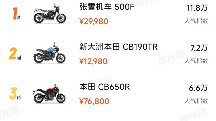 此类车型中人气排名前10的车型分别是:张雪500F、新大洲本田CB190TR、本田CB650R、本田CL300、五羊本田CGX150、本田CB500SF、豪爵DN150、凯旋Speed400、五羊本田CG125、宝马R NineT。