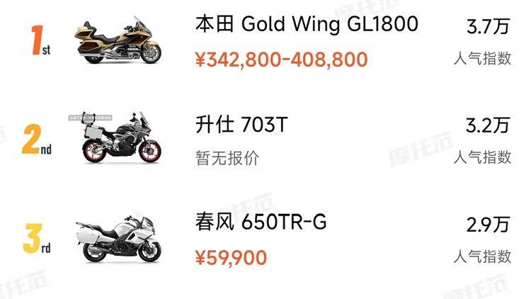 这类车型中排名靠前的车型分别是:本田GL1800、升仕703T、春风650TR-G、长城灵魂S2000、宝马K1600、宝马R1250RT、川崎 H2 SX、宝马F900 XR、S1000XR、川崎 Ninja 1000SX。