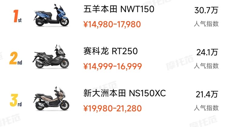 踏板类摩托车中人气排名靠前的车型有:五羊本田NWT150、赛科龙RT250、新大洲本田NS150XC、豪爵UHR150、升仕368G、天鹰TX150、济南铃木UY125、雅马哈XMAX300、新大洲本田NS125LA、豪爵UFR150。