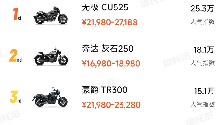它们当中张雪500RR热度最高人气指数达到了44.6万,而紧跟其后的基本上都是四缸车型,当然也有小单缸和直列双缸,但四缸车型的占比可谓是前所未有,且前五款车型的价格基本上都维持在了2~3万元,这在以前是想都不敢想的。
