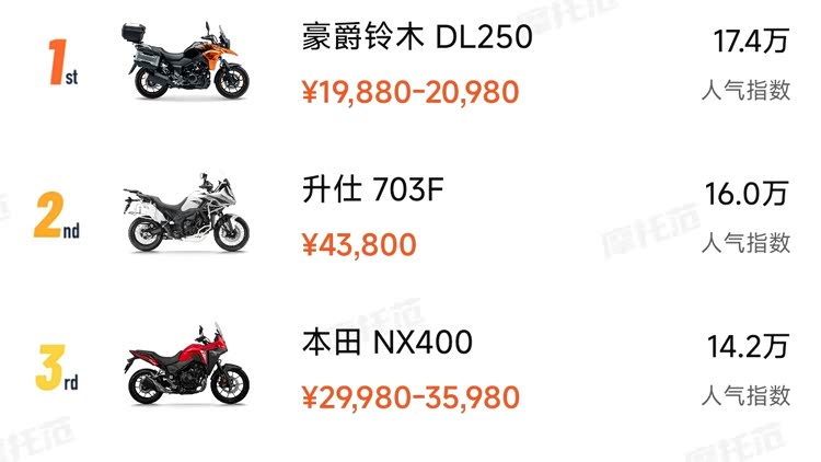 这一细分类别中人气较高的车型分别是:豪爵铃木DL250、升仕703F、本田NX400、贝纳利TRK552、凯越525X、宝马R1250GS、无极DS525、春风450MT、春风700MT、凯越625X。
