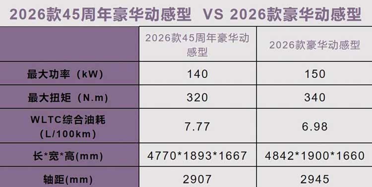 从基本参数来看,2026款豪华动感型的动力提升、车身和轴距都变大,同时能耗变低,这算是一大进步。