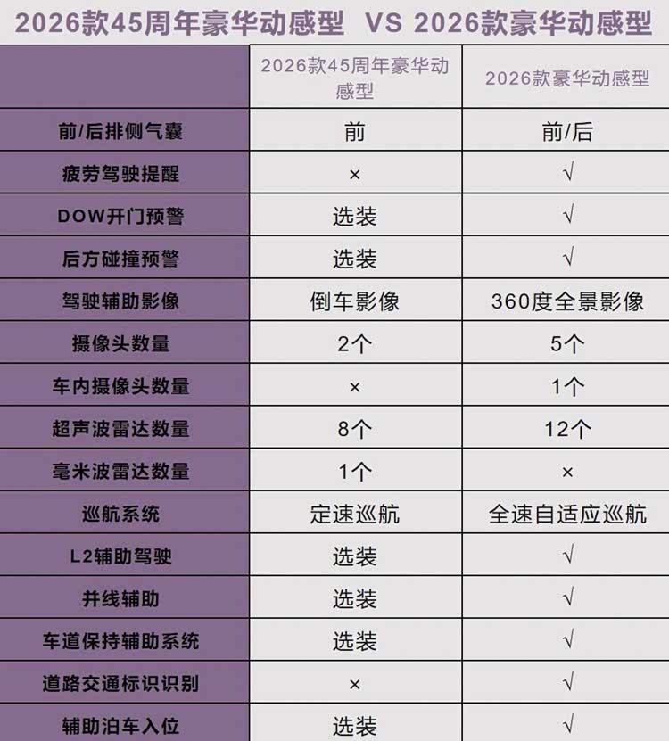 至于辅助驾驶以及安全配置上,2026款豪华动感型的提升还是很明显的,配备了DOW开门预警、360度全景影像、L2辅助驾驶等,这些在45周年豪华动感型上都需要选装。