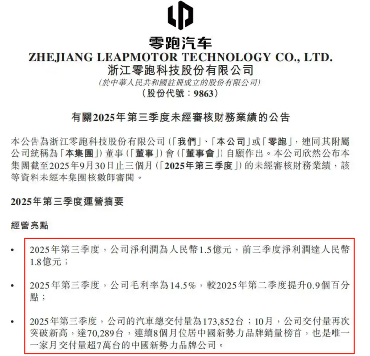 其中,零跑的成绩最为亮眼。根据零跑披露的三季报显示,报告期内,公司实现营收194.5亿元,较2024年同期的98.6亿元同比增长97.3%。同时,继2025年上半年首次实现半年度净利润转正之后,零跑在三季度实现单季度盈利1.5亿元,前三季度净利润1.8亿元。