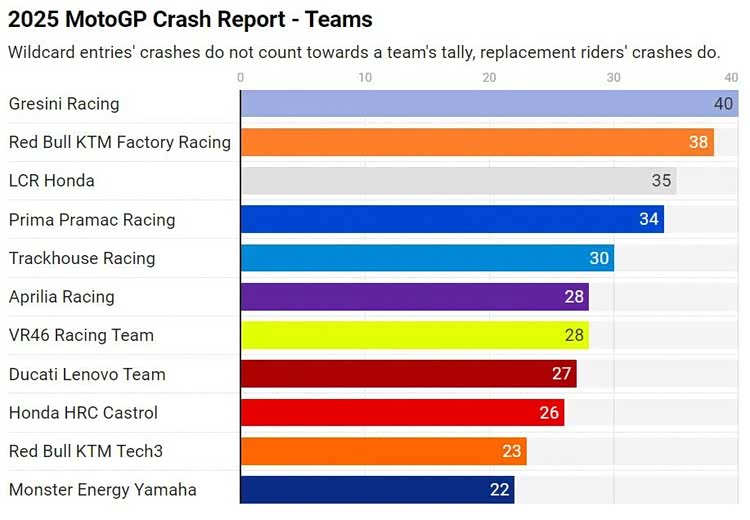 从车队维度统计,得益于小小马的23次和费尔明的17次摔车,格雷西尼车队成为全年摔车次数最多的车队。排在第二的红牛KTM成为前五名中唯一的厂队。以上统计包含代班车手但不含外卡车手。