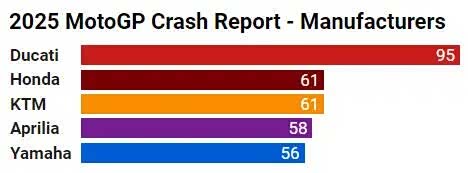 制造商维度,杜卡迪因为比其他阵营多出两个席位,所以摔车次数更突出,其他厂牌则基本打平。将这个数据按人均计算后,杜卡迪阵营仍然以人均15.83次摔车名列第一,最低的雅马哈阵营人均14次摔车。