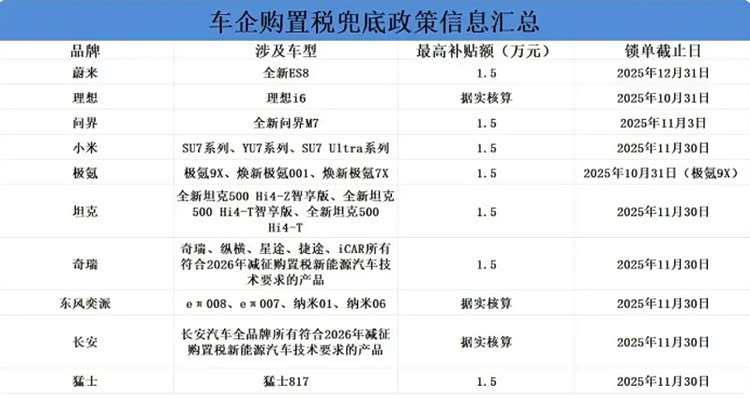 距离年底尚不足月,虽然像小米等车企提出了购置税补贴政策,即在2025年底前锁定大定的不论年底或2026年提车,均可享受厂家的1.5万元的购置税补贴,这也是变相的一个优惠,但对于广大消费者而言,如果是刚需购车就没必要赶那个时间节点,早定早享受。