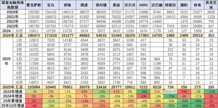 细看进口车的大头,包括BBA、Mini、捷豹、林肯在内的豪华车品牌,2025年累计增速都是负数,有的还达到了-98%,唯独雷克萨斯成了全村的希望。