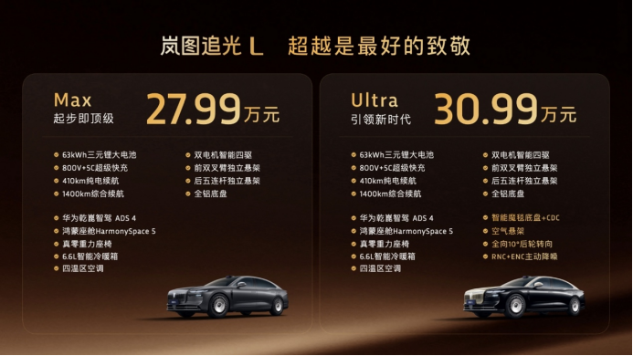 12月10日,岚图汽车旗下新时代旗舰轿车——岚图追光L正式上市,共推出2款版型,售价分别为Max版27.99万元、Ultra版30.99万元。