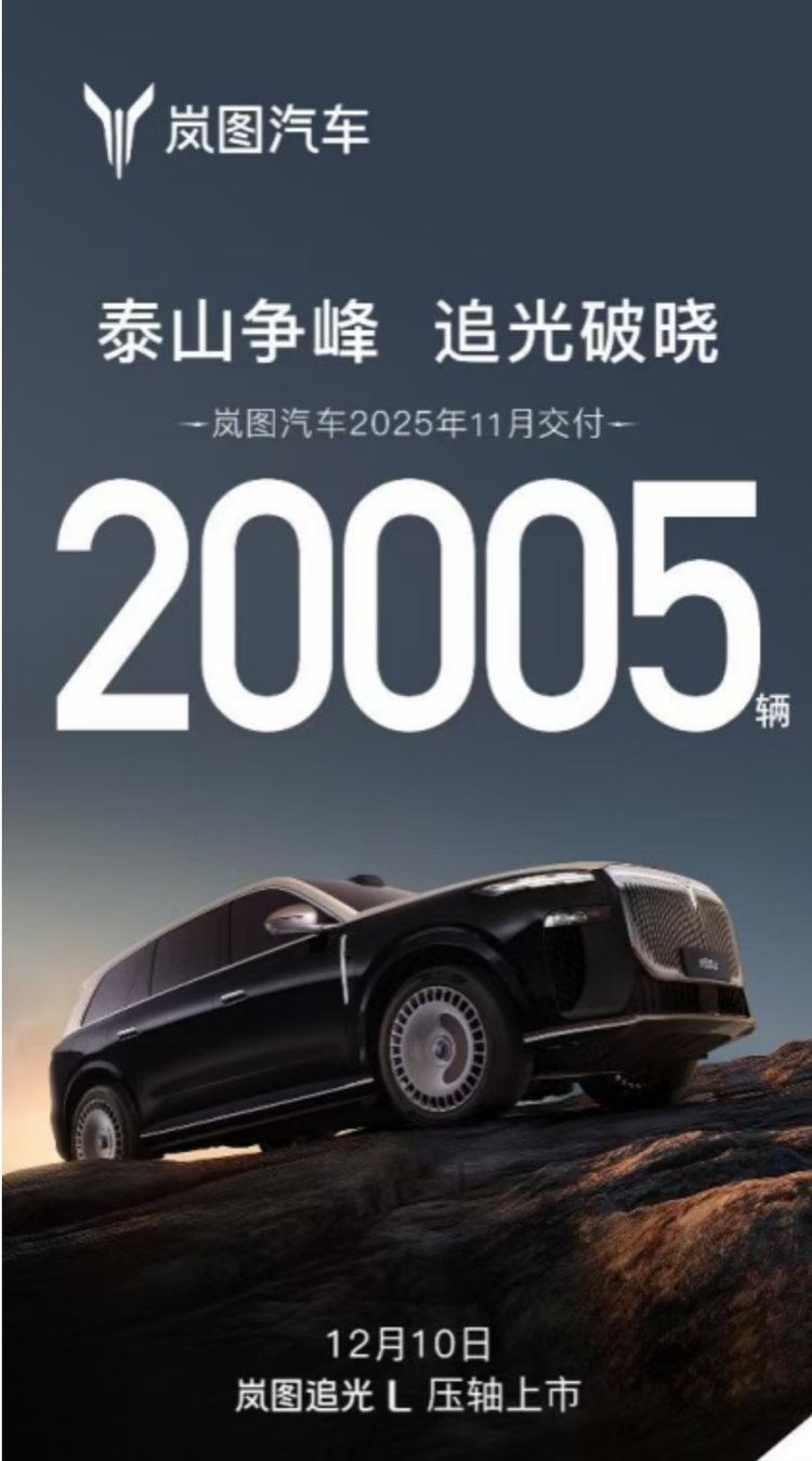 更重要的是,其增长并非依赖单一爆款,而是依托于“SUV+MPV+轿车”全矩阵的体系化成功。其中, 岚图FREE(参数|询价)+跻身20-30万混动SUV销量TOP3,全新知音位列30万元内华为系纯电车型销量榜首,2026款梦想家连续多月稳居高端MPV销冠地位,单车均价超40万元。11月岚图泰山上市,21分钟锁单量突破10000台。