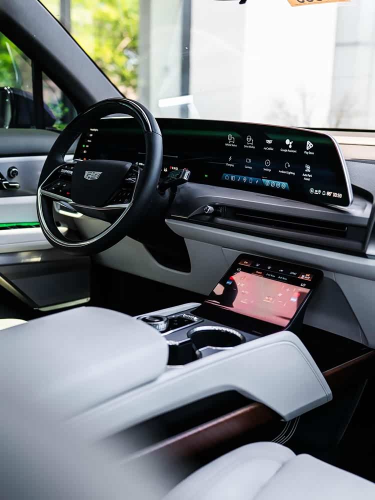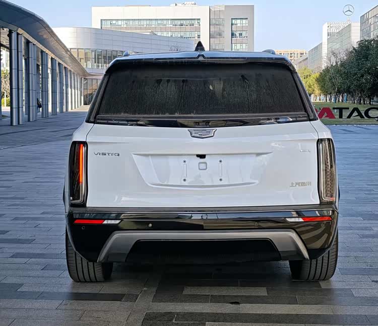 车尾部分,VISTIQ采用了凯迪拉克电动家族经典的上下分体式尾灯组,造型立体且点亮后科技感与辨识度兼具。底部熏黑后包围嵌入枪灰色梯形饰件,延续了车头与侧面的肌肉感设计语言。根据官方数据,该车最大接近角为19°,最大离地间隙达到193mm,这意味着它不仅能在城市中从容出行,也具备一定的轻越野通过能力,拓展了使用场景。