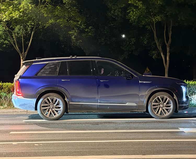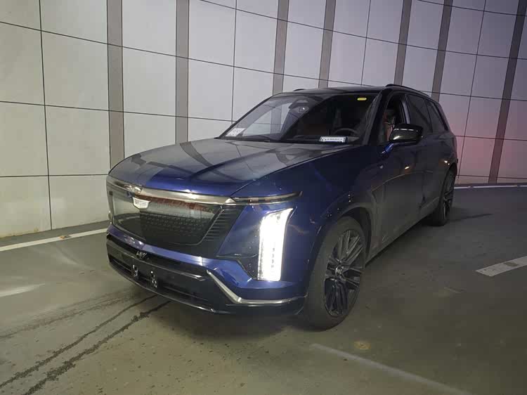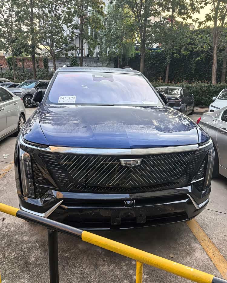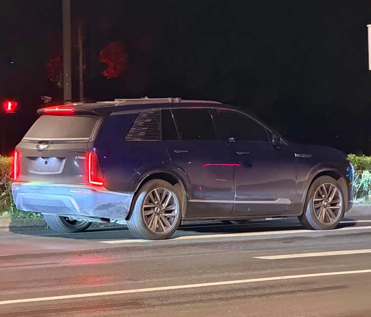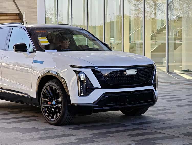 外观方面,从实车图来看,VISTIQ延续了凯迪拉克IQ家族标志性的封闭式前脸设计。大尺寸盾形熏黑格栅内部融入了发光元素与可点亮logo,在夜间极具辨识度。两侧狭长的日行灯通过贯穿式镀铬饰条相连,既强化了视觉宽度,也提升了科技质感。经典“獠牙”造型的流光星雨直列式LED大灯得以保留,配合梯形前包围处硬朗的线条刻画,整体车头显得威严且富有攻击性。