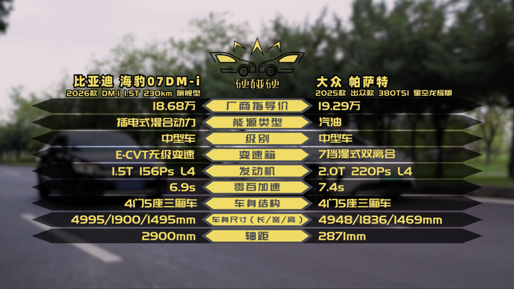 这一期的双车对比,我们以2026款海豹07DM-i 1.5T 230KM 旗舰型(18.68万元)和帕萨特2025款出众款 380TSI星空龙耀版(19.29万元)两款车型为参考车型,来替大家找找答案。