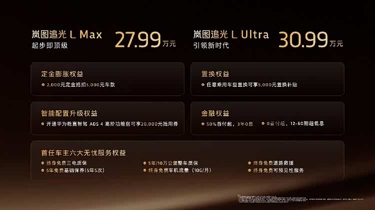【2025年12月10日,北京】12月10日,主题为“破晓”的岚图追光L上市发布会在北京举行。新车指导价为27.99万-30.99万元,推出2个配置版型,并公布了总价值5.2万元的终身三电质保、5年免费基础保养等首任车主6大无忧服务权益,以及超高价值的3年0息金融权益。岚图追光L的正式上市,补齐了岚图汽车三旗舰矩阵的最后一块拼图,与岚图泰山和岚图梦想家一同强力冲击高端豪华车市场。岚图追光L搭载多项行业第一、同级唯一的科技配置,强势突破豪华轿车市场的品类天花板,以代际领先的非凡实力,打造中国高端旗舰轿车的价值新标杆。