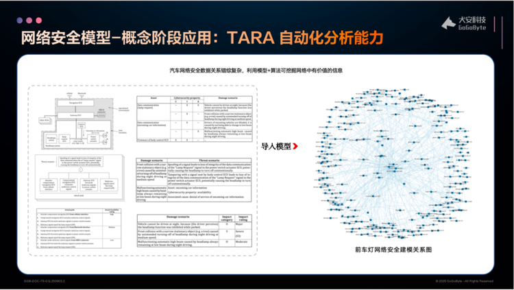 这是一个我们举的例子,把这个相关的汽车的模型,网络安全法规的要求基于我们的模型数据去表示之后,在系统里面可视化展示出来,这还是一个小的系统,只是车灯控制系统,超出了我们一般安全工程师人脑能分析的程度。